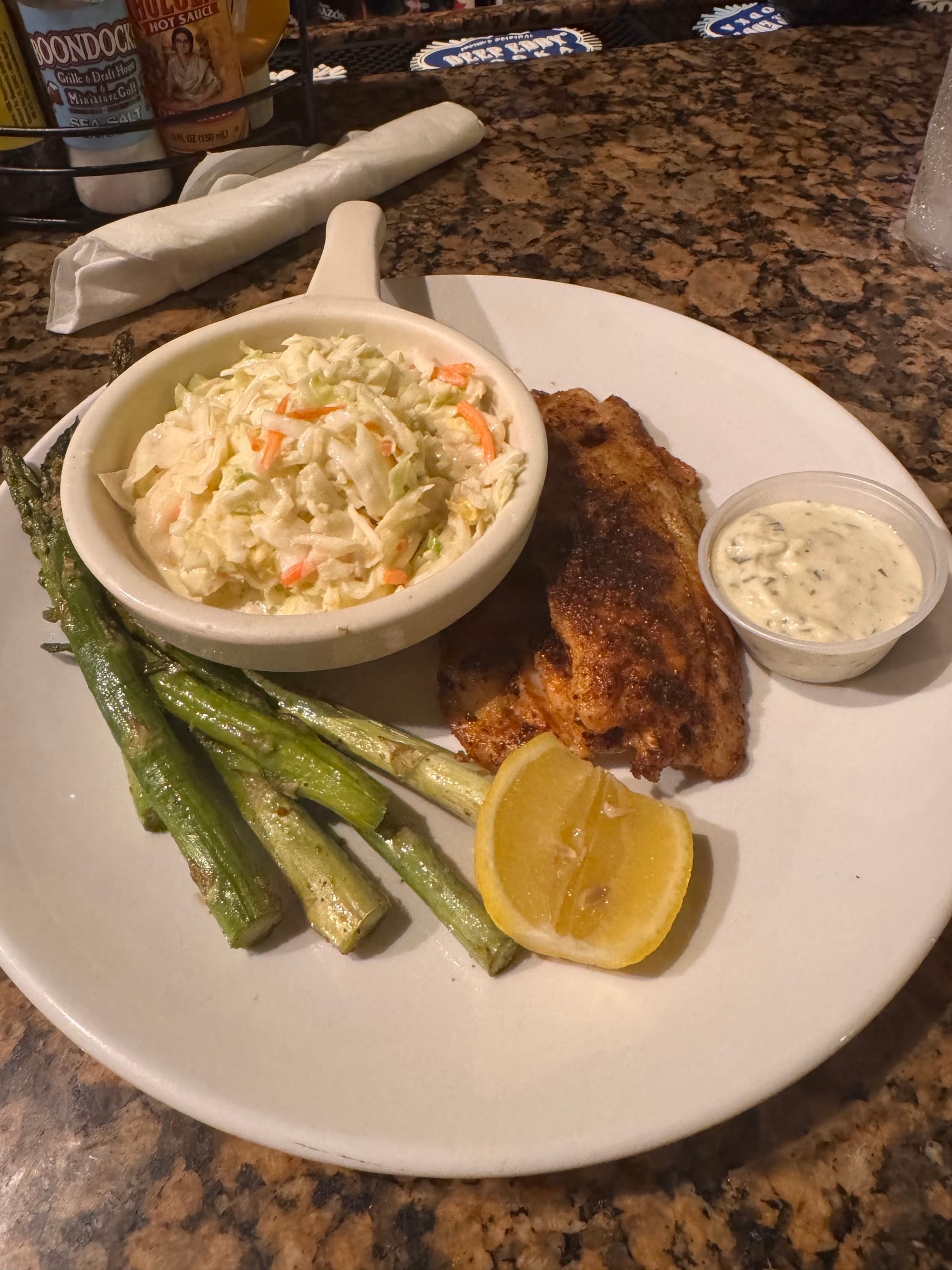 They serve yellow tail, grouper and hogfish fresh and cooked however you choose. I asked for Blackened and asparagus. It was really good, simple, well prepared and quick. Reasonably priced as well. I'm giving this a 4.8 but don't let that fool you, it's worth the stop if you need a good meal and can't make it all the way to Key West. Or the Square Grouper is closed on Sundays!